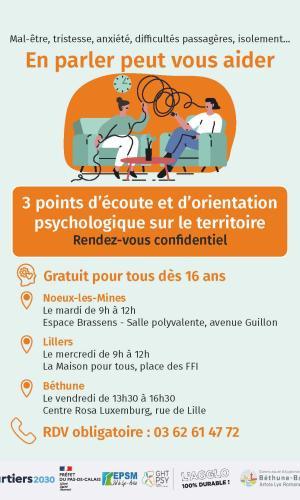 En cas de détresse psychologique, de mal-être, de difficultés personnelles ou familiales... Trois points d’écoute et d’orientation psychologique sont à votre disposition de façon gratuite, pour les plus de 16 ans, à Lillers, Béthune et Nœux-les-Mines :