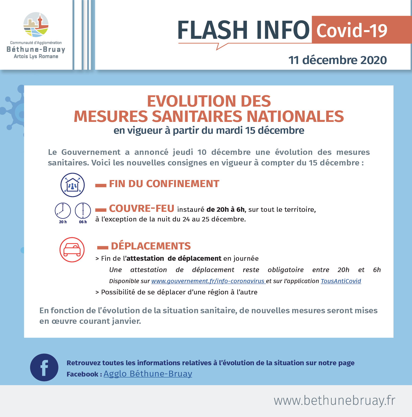 Info Covid-19 : Mesures sanitaires nationales Afin de lutter contre la progression du virus, le gouvernement adapte les mesures sanitaires. Publié le 29 octobre 2020 Retrouvez ci-dessous les principales mesures annoncées le jeudi 10 décembre 2020 par le gouvernement. Precedent Retour à la liste Suivant