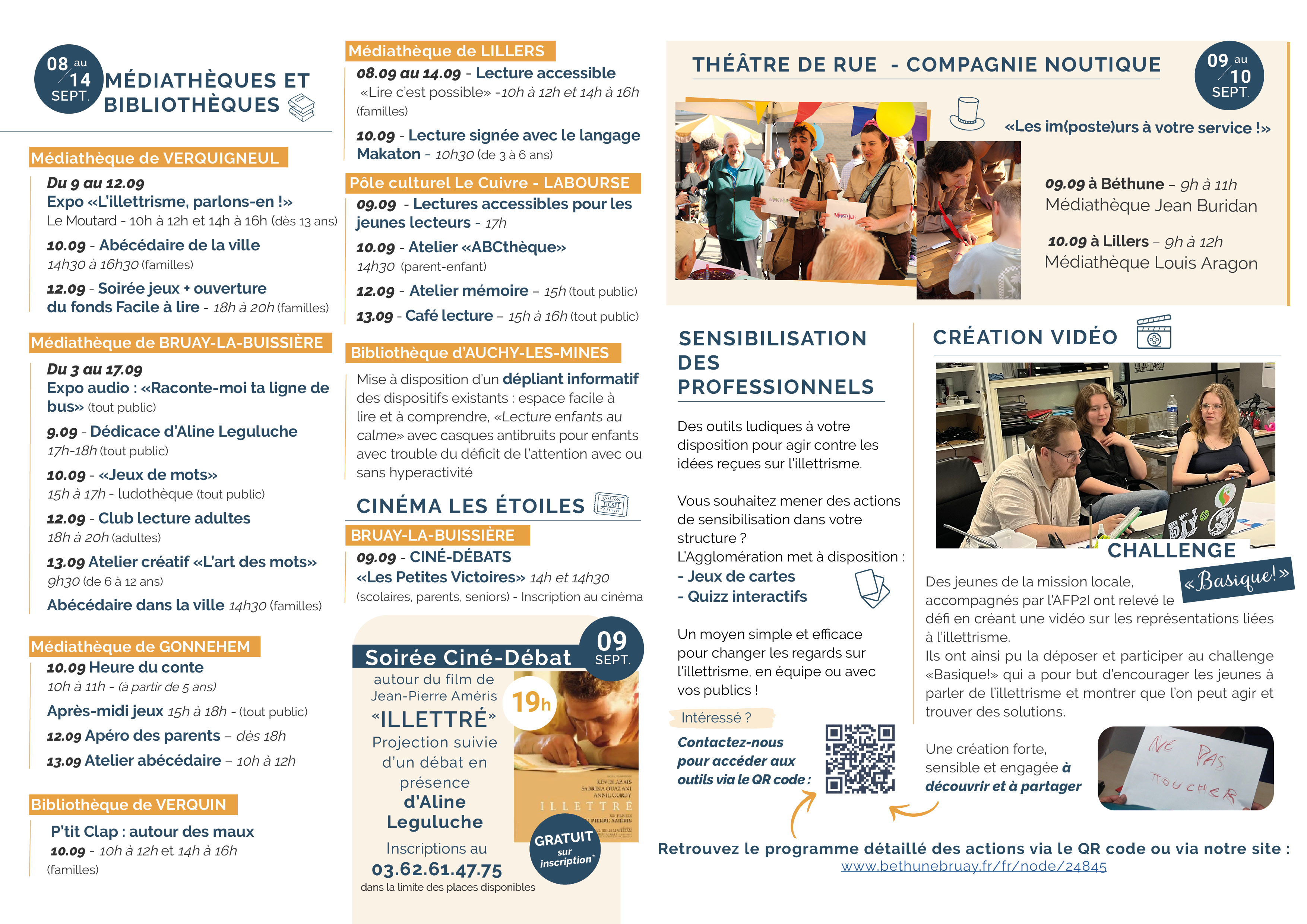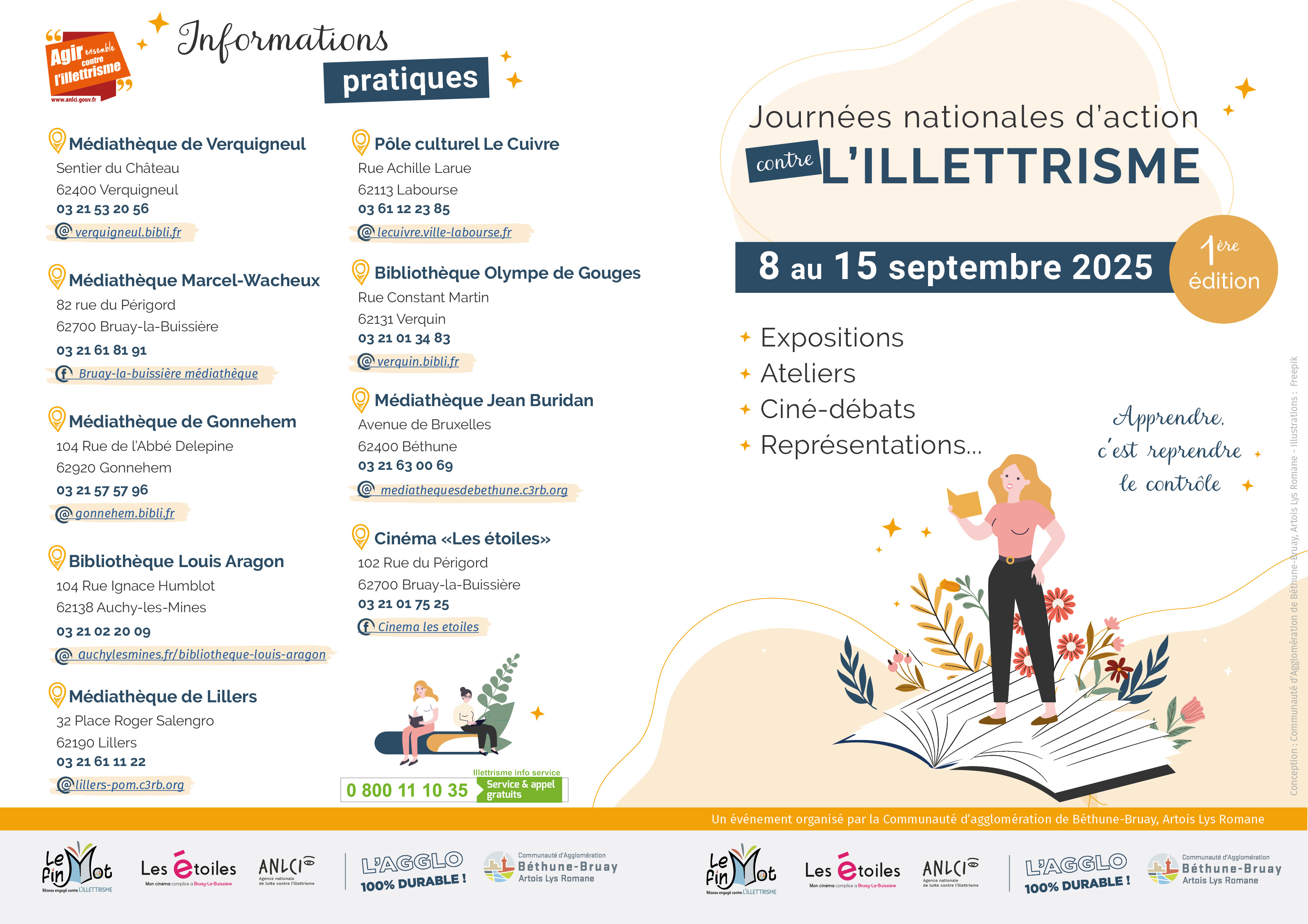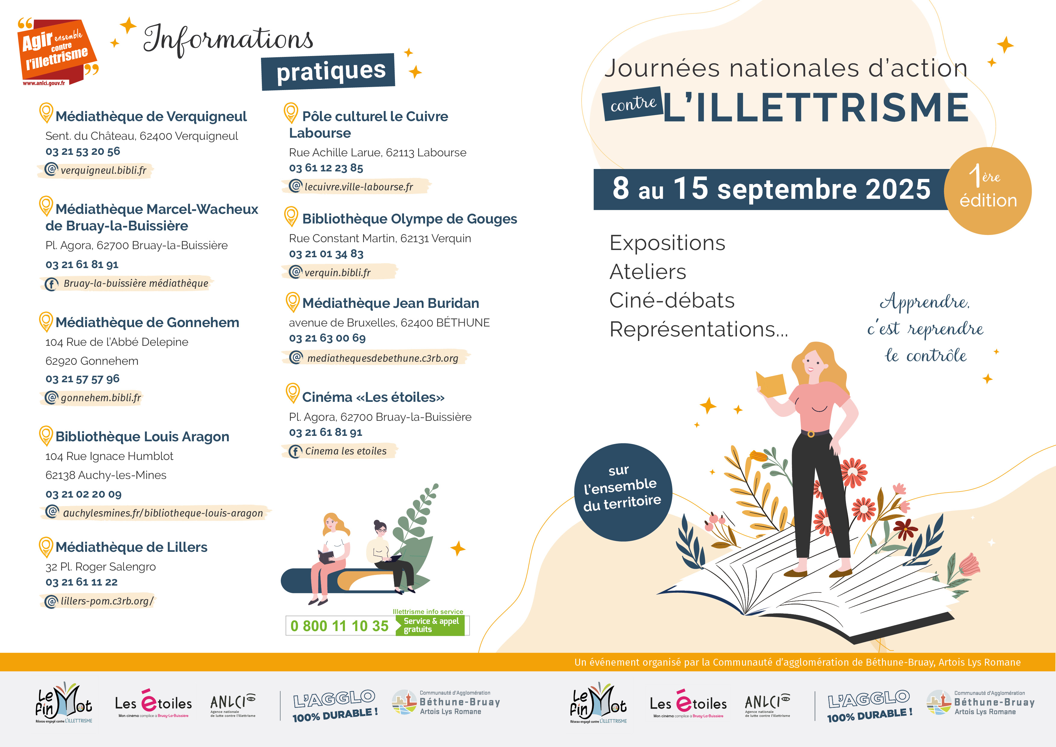 La Communauté d’Agglomération de Béthune-Bruay, Artois Lys Romane, en partenariat avec l’Agence Nationale de Lutte contre l’Illettrisme (ANLCI), organise pour la première fois les Journées Nationales d’Action contre l’Illettrisme (JNAI) du 8 au 15 septembre 2025.