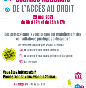 Journée nationale de l'accès au droit : bénéficiez de consultations juridiques gratuites à distance ! A l'occasion de la journée nationale de l'Accès au Droit le 25 mai prochain, nous