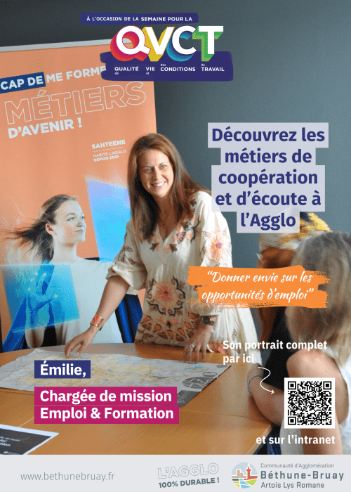 Émilie est entrée à l’Agglomération de Béthune-Bruay en 2018 comme responsable de la plateforme Proch’emploi, un dispositif copiloté par L'Agglo et la Région Hauts-de-France pour faire le lien entre demandeurs d’emploi et employeurs peinant à recruter.