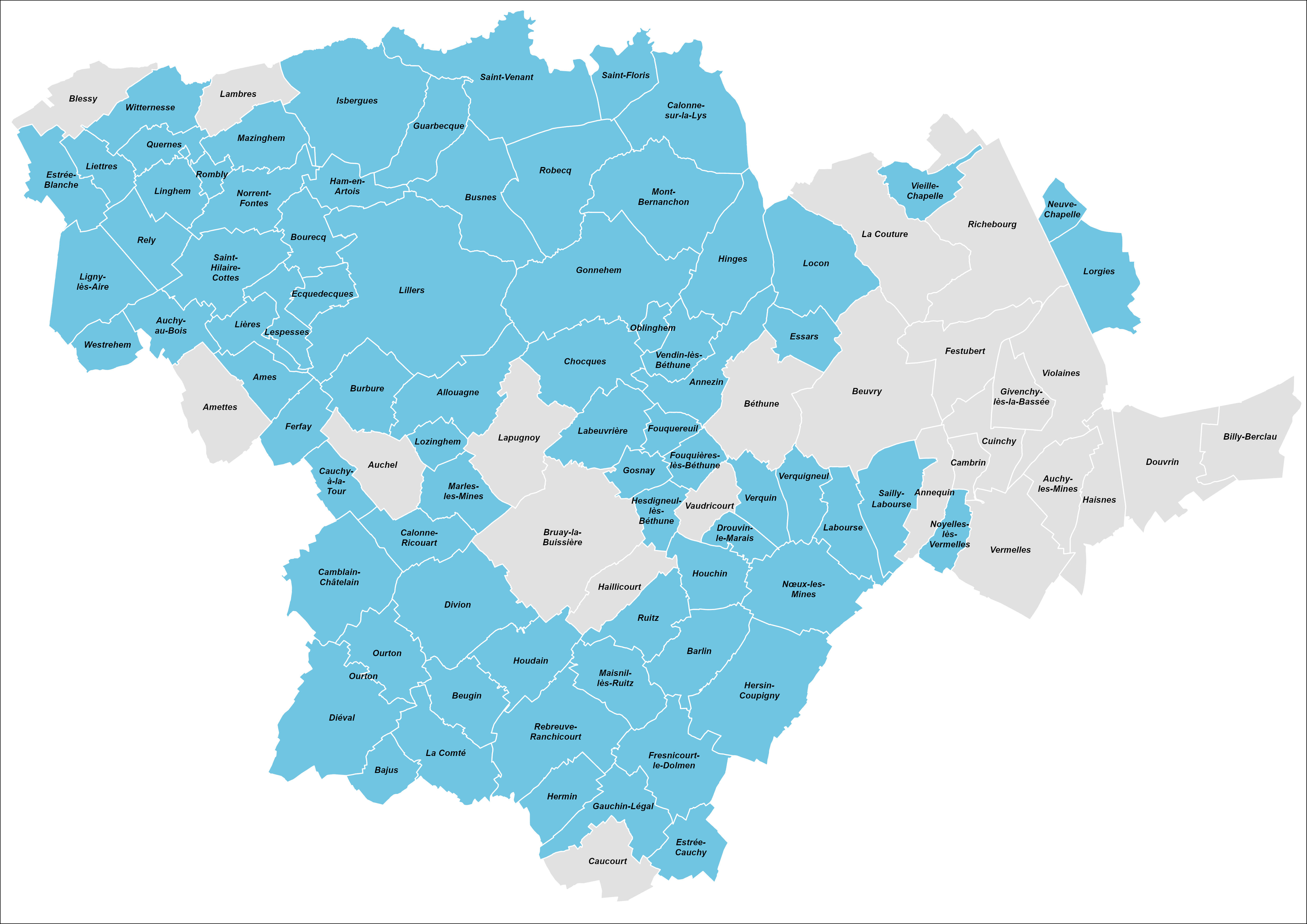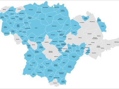 Un guichet unique permettant aux particuliers et aux professionnels de déposer en ligne les dossiers est ouvert pour les 76 communes adhérentes (ci-dessous en bleu) au service mutualisé de l’instruction pour les autorisations d’urbanisme (certificats d’urbanisme, déclarations préalables et demandes de permis).