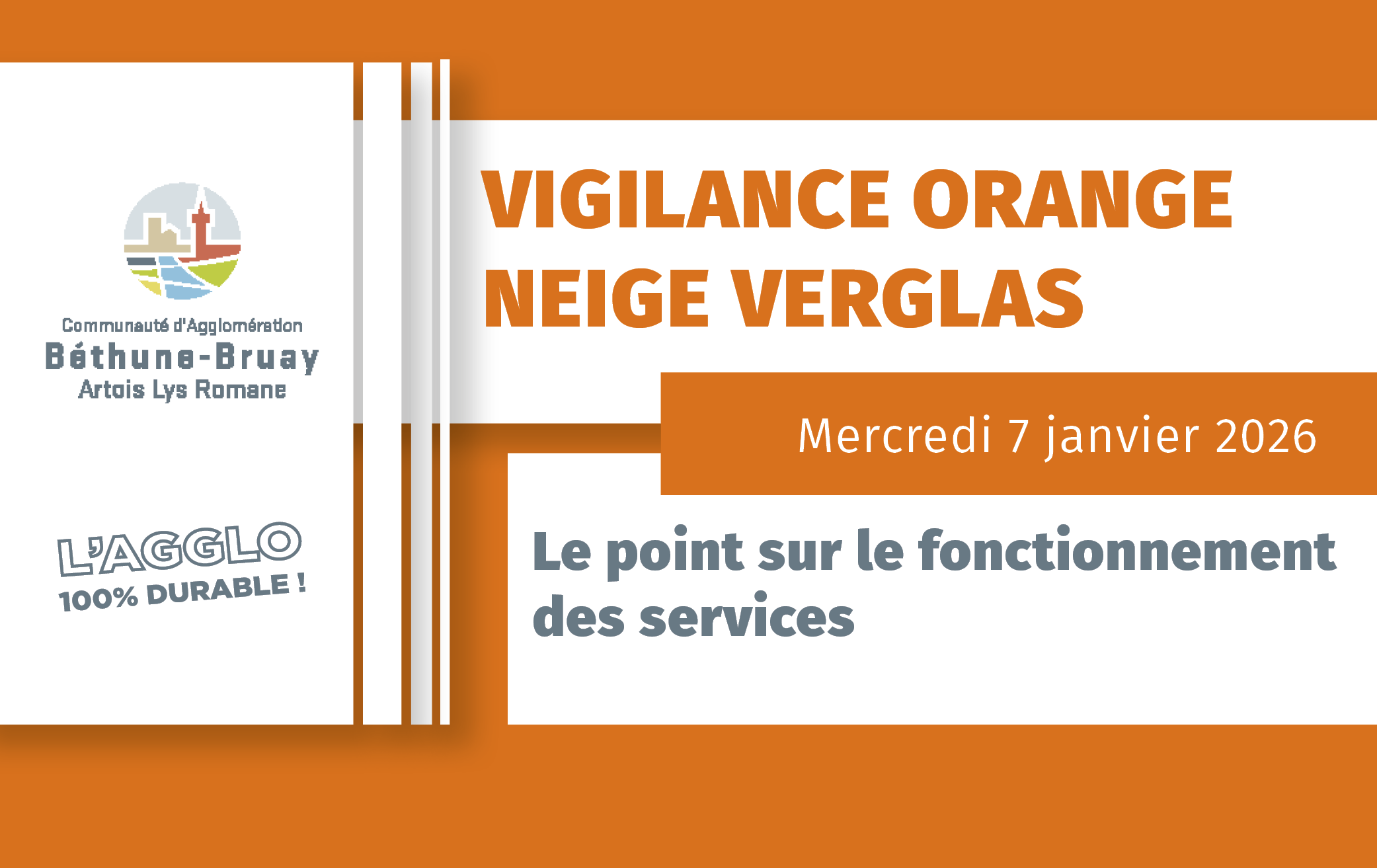 Météo-France a placé le département du Pas-de-Calais en vigilance orange neige-verglas ce mercredi 7 janvier jusque 14h. Compte tenu de cette situation météorologique exceptionnelle et des chutes de neige constatées sur le territoire, la Communauté d'agglomération adapte l'organisation de certains de ses services.