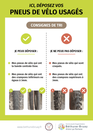 Les pneus de vélo craqués ou aux crampons supérieurs à 3 mm ne sont pas valorisables, et ne peuvent donc pas être déposés dans les bacs de collecte "La Vie est Bel t".