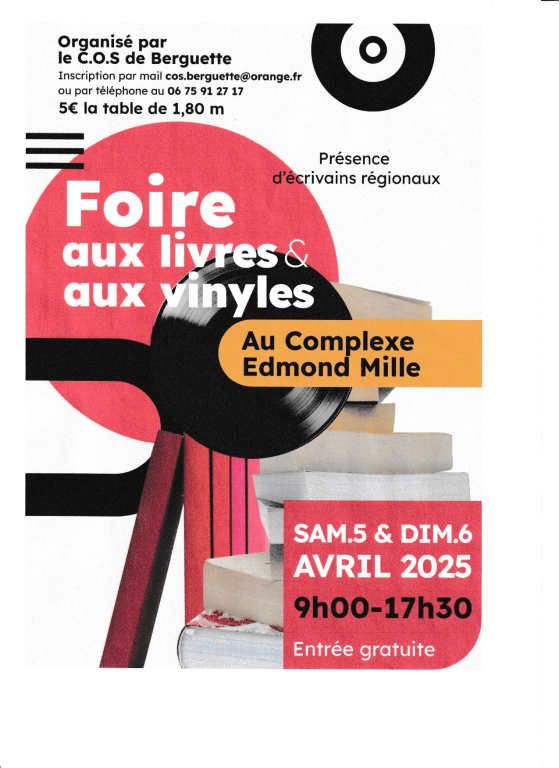 Le COS de Berguette (commune associée d'Isbergues) organise le samedi 5 et dimanche 6 Avril une foire aux livres et aux vinyles au complexe Edmond Mille de Berguette de 9H00 à 17H30. Entrée gratuite. Buvette et petite restauration sur place. Parking gratuit. Toilettes à l' intérieur de la salle. Accès aux PMR. Pour tout renseignements et inscription à l'adresse mail suivante cos.berguette@orange.fr ou au 06/75/91/27/17
