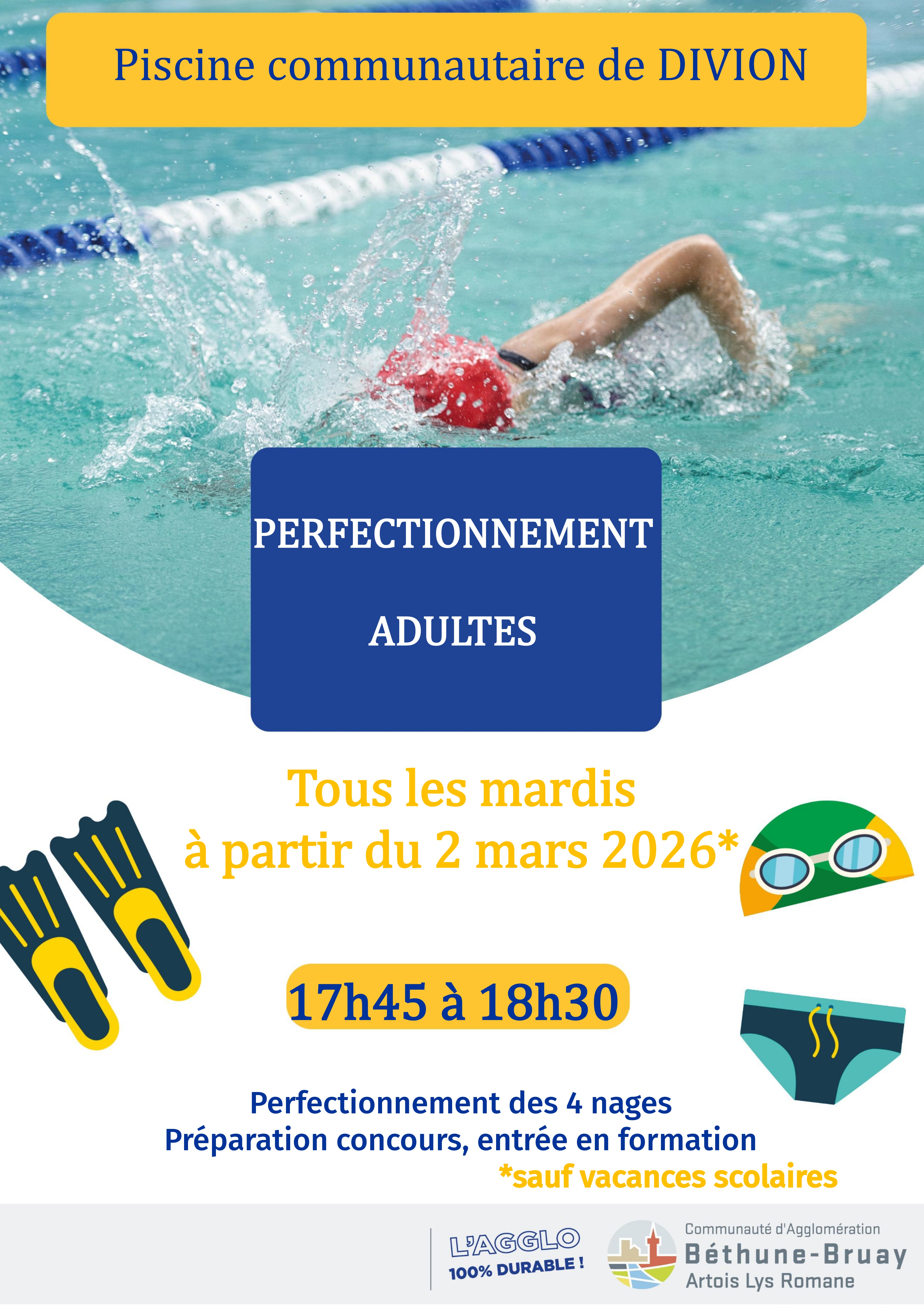 Venez découvrir le perfectionnement adultes à la piscine communautaire de Divion tous les mardis à partir du 2 mars 2026.
