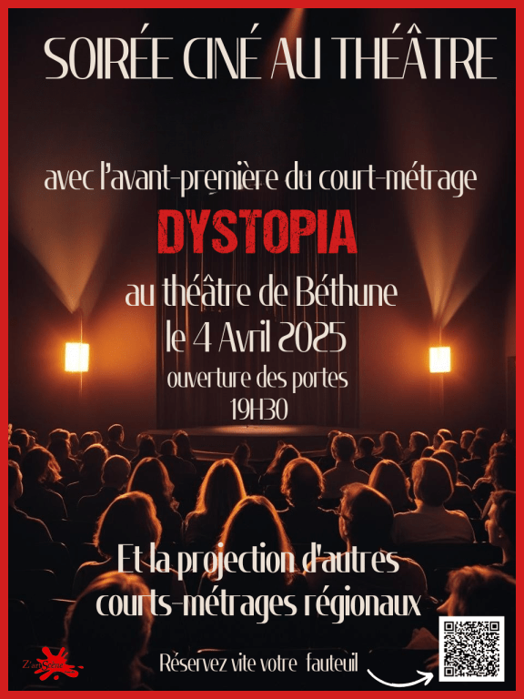 Une soirée ciné au théâtre ça vous dit ? A l'occasion de l'avant-première du court-métrage "DYSTOPIA", réalisé dans le béthunois en 2024, l'équipe du film en profite pour vous concocter une soirée de diffusion de courts-métrages variés (animation, drame, comédie...) de réalisateurs amateurs, étudiants ou professionnels de la Région des Hauts de France. L'occasion de découvrir l'univers du court-métrage, et de vous transporter l'instant de quelques minutes dans différentes thématiques dans un lieu magnifique qu'est le théâtre municipal de Béthune. Prenez place pour un voyage cinématographique le 4 Avril 2024 au soir pour 1 euro, vous avez bien lu, 1 euro ! Il y aussi la possibilité de faire un don pour soutenir l'inscription du film sur le chemin des Festivals, mais bien sûr, ce n'est pas une obligation 😉 Enfants bienvenus => conseillé à partir de 8 ans Pour la place, c'est ici que ça se passe : https://www.helloasso.com/associations/z-artscene-comedie/evenements/court-en-nord-au-theatre Vous voulez en savoir plus sur le court-métrage "Dystopia" ? C'est par ici : https://www.facebook.com/share/19pp7w8oSV/ Belle journée à tous.