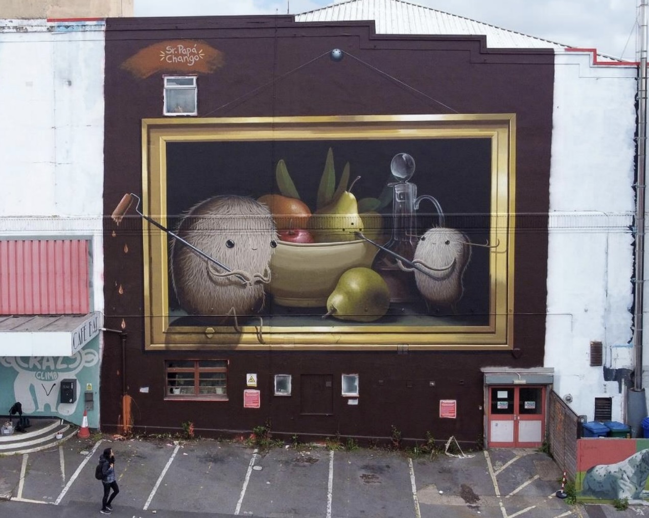 Ses œuvres, simples mais pleines de cœur, cherchent à toucher à la fois l'esprit et l'âme des spectateurs. Ayant peint des fresques au cœur de 12 pays, de l'Allemagne à la Colombie, en passant par l'Irlande et le Mexique, Sr. Papá Chango aime l'idée de fusionner avec la culture urbaine et de créer des liens avec les personnes et les lieux qu'il rencontre.